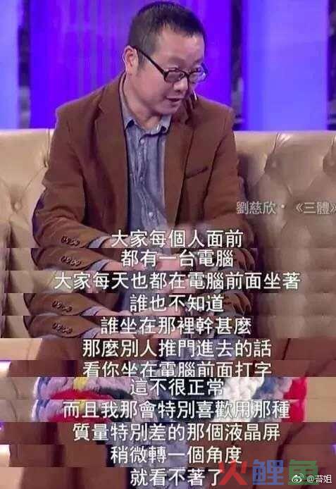 刘慈欣还说,大家每个人面前都有一台电脑,每天都在电脑前坐着,谁也不知道谁坐在那里干什么,那么别人推门进去的话,看你坐在面前打字这不很正常,而且那会特别喜欢用质量特别差的液晶屏,稍微转一个角度就看不着了。