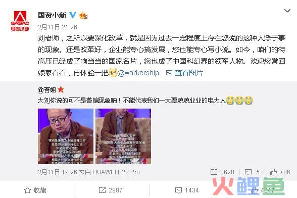 有一些网友就此微博私信@国资小新,2月11日晚, @国资小新转发此微博并评论:“刘老师,之所以要深化改革,就是因为过去一定程度上存在您说的这种人浮于事的现象。还是改革好,企业能专心搞发展,您也能专心写小说。如今,咱们的特高压已经成了响当当的国家名片,您也成了中国科幻界的领军人物。欢迎您常回娘家看看,再体验一把”。
