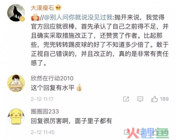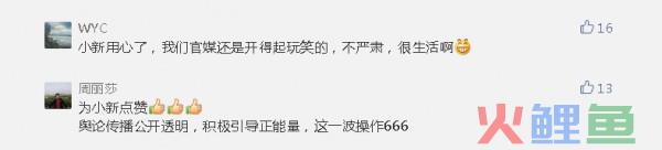 很多网友认为,@国资小新 与刘慈欣的互动显得非常幽默、有水平,“舆论传播公开透明,积极引导正能量”“面子里子都有”“非常有责任感”“教科书般的答复,优秀公关案例”。