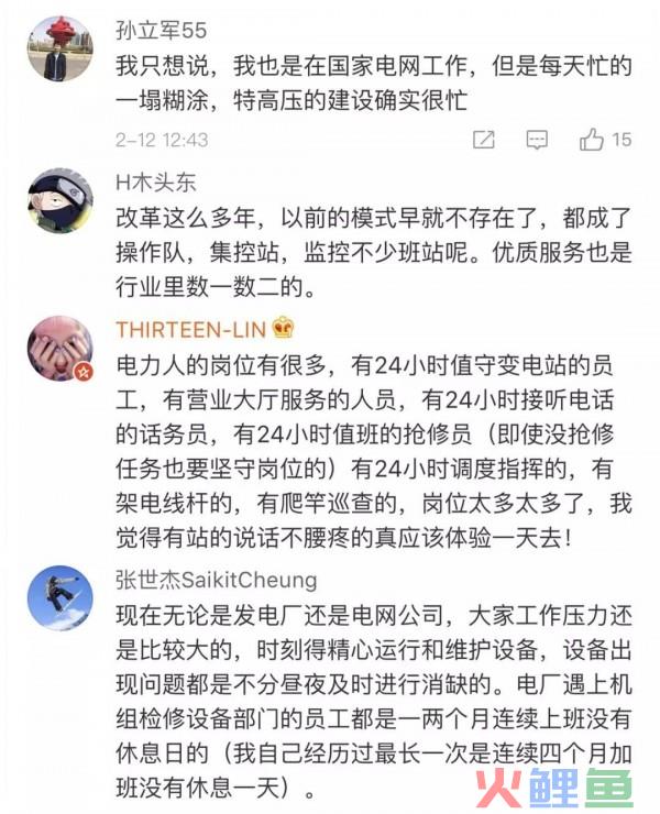 “国资小新”的回应口径引发了包括广大国企员工在内网友的强烈共鸣。在网上互动讨论中,许多网友表示,现在无论是发电厂还是电网公司,大家的工作压力还是比较大的,时刻要维护设备的正常运转,设备出现问题都是要不分昼夜及时进行处理的。也有网友表示,不论是炎炎烈日还是大雪纷飞,也不论是白天还是晚上,也不论是平时还是逢年过节,更多的电力职工还是“累成狗”的状态,为百姓提供光明的始终是兢兢业业的“电力人”。