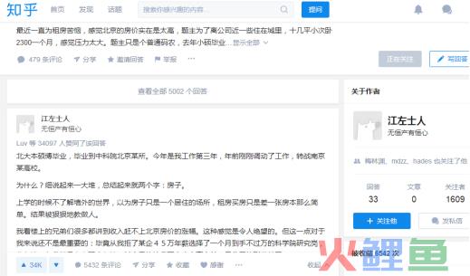 以今年3月份刷屏的“学区房”为例,阿星注意到第一篇关于学区房的10万+,是某高校公众号全文转载知乎网友@江左士人关于“北京高房价是否透支年轻人的创造力和生活品质?”赞数最高的热帖。这篇批判北京房价的帖子引发关于买房讨论的蝴蝶效应,让今年学区房的房价在一片哀叹中又翻了番,是不是很吊诡?