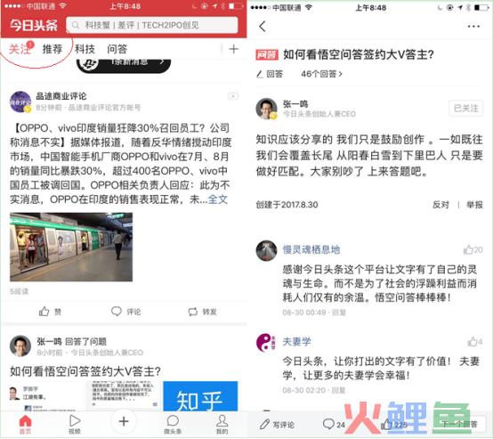 (左图首页显示其实是“关注”而非“推荐”,并且在首页中加大了悟空问答的流量推荐)