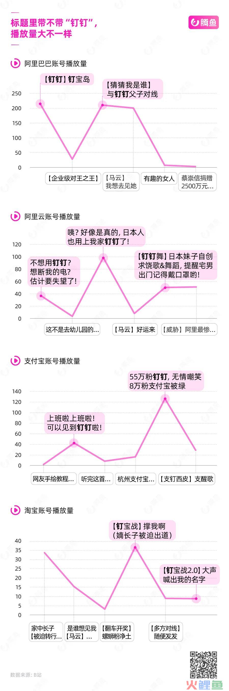 钉钉火了之后,一大批大厂运营纷纷重兵布局B站。阿里巴巴、淘宝、支付宝、阿里云等阿里系官方账号都玩起了鬼畜,不甘示弱的腾讯也用视频《B站股东卖艺求上首页》回应,正式加入“又疯一个官方”大军。这一切,都要从3个月前说起。