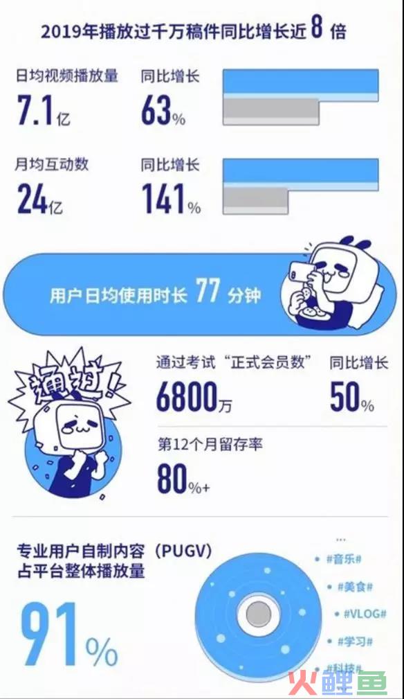 根据B站公布的数据,2019年B站月均活跃用户是1.3亿,第12个月留存率有80%以上,而用户的平均日使用时长达到77分钟,PUGV(专业用户自制内容)占平台总播放量的91%。也就是说,这1.3亿个年轻人,每个人每天都会在B站停留一个多小时,除了打游戏、看直播、购物之外,大部分人还是在看UP主创作的视频。