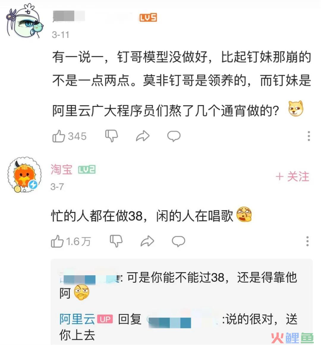 “淘宝能不能过38,还是得靠阿里云”,“原来优酷也是阿里的”,“莫非钉哥是领养的,而钉妹是阿里云广大程序员们熬了几个通宵做的?”。
