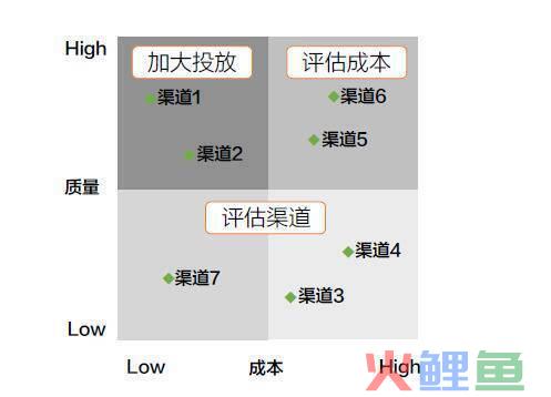 投放渠道的甄选利用四象限划分模型:对于渠道1与2这种类型是继续保持,渠道5和6是需要评估成本,控制预算投放。