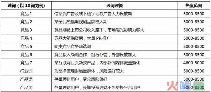 其它词:根据用户偏好选词,如P2P行业监管以及存量用户性质,偏短期高收益、活期;以及理财超市CPS产品词(top2/top3蹭量)