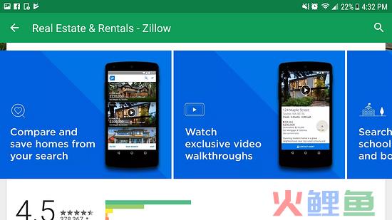 Zillow采用创新的截图方法,使用横向截图来使每个截图有更大的展现面积; 所以,这种截图能使Zillow能够执行具有故事风格的屏幕截图设计,而且更长的字幕不需要牺牲可读性。Zillow还使用不同的图标来强调每个屏幕截图中的主要信息。