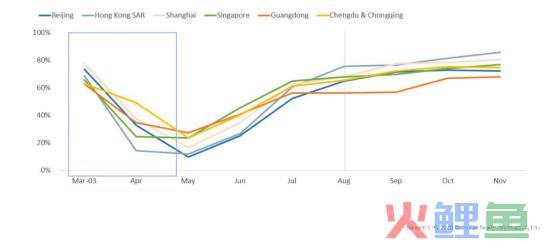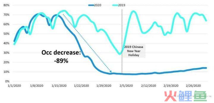 2003年非典期间,中国内地酒店的表现在2003年5月落到低谷,整体市场的入住率从70%以上的水平跌至最低18%的入住率。而根据STR的数据,在2020年1月14日之后的短短两周,国内地市场酒店入住率就从70%的高位,就跌落至个位数——只有8%。在随后的22天,市场入住率一直在保持在极低的水位——低于10%。随着疫情慢慢开始得到控制,入住率在3月初稍有复苏,回升到达到14%,但是仍然远低于上年同期水平。