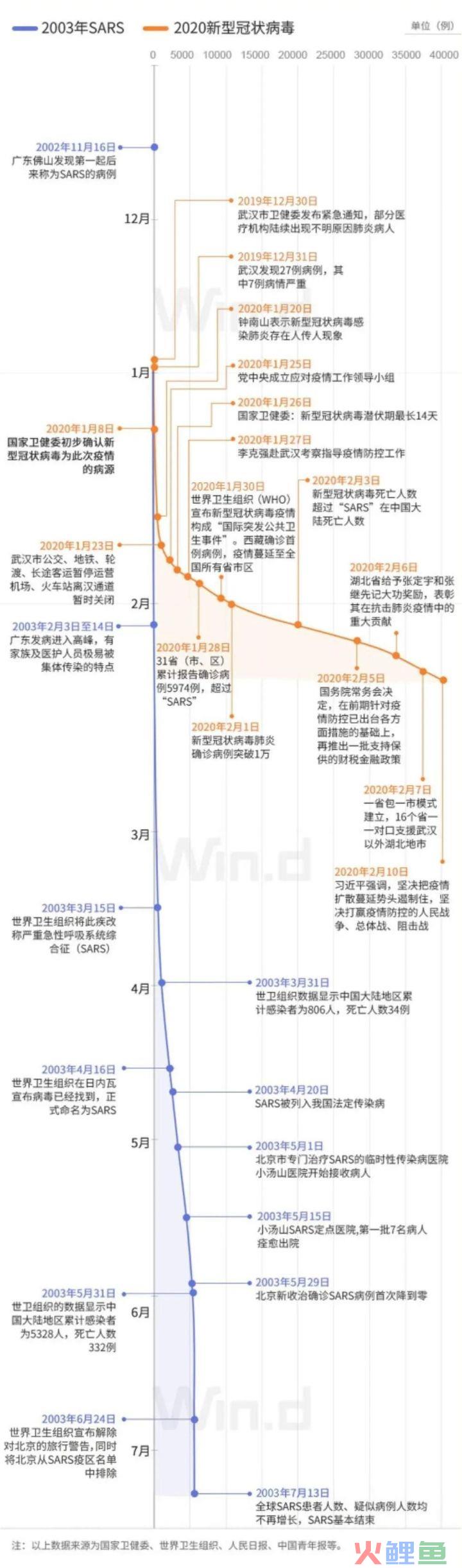和2003年的SARS相比,2020年的新冠肺炎死亡率较低,但传播速度更快,传播的人数更多虽然两次疫情有很大的区别,但是比较两次疫情的发展,目前两者发展情况基本契合,对预估新冠疫情持续的时间具有参考意义。通过Wind资讯的一个对比图看出两者之间发展变化。