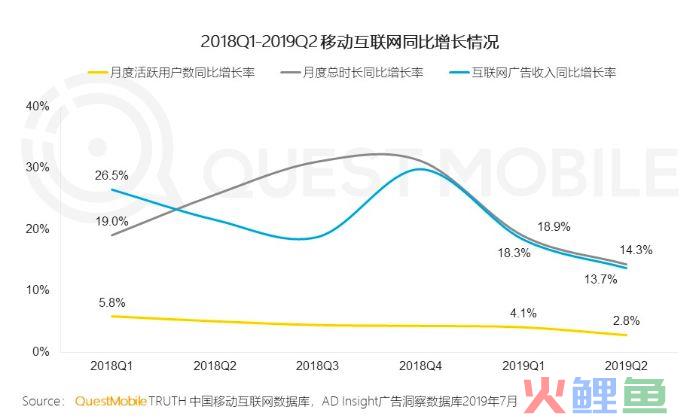 同时,整个广告大盘存在着不确定性。据QuestMobile数据,2019年上半年,移动互联网流量和广告收入呈现“双降”趋势,下半年的移动互联网用户规模增速已降到了“1%”时代。