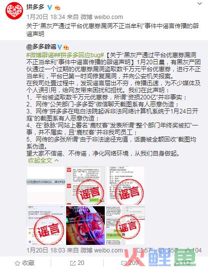 极短的时间内,拼多多因此资损200亿的消息传遍网络,但很快被拼多多官方辟谣:“资损200亿”系谣言,并说明此次平台BUG事件是黑灰产团伙作案,已向公安机关报案。