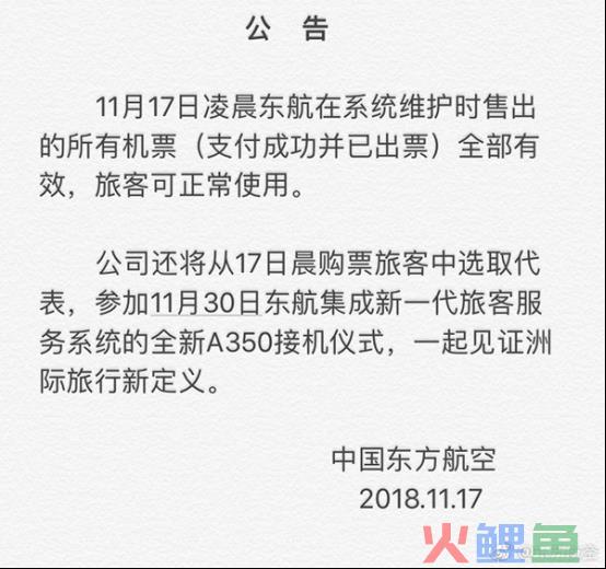 在网友纷纷猜测东方航空会以什么借口来解释这次系统BUG,想让BUG期间所售的机票失效的时候,东方航空官方发出公告:BUG期间所售出的白菜价机票全部有效!