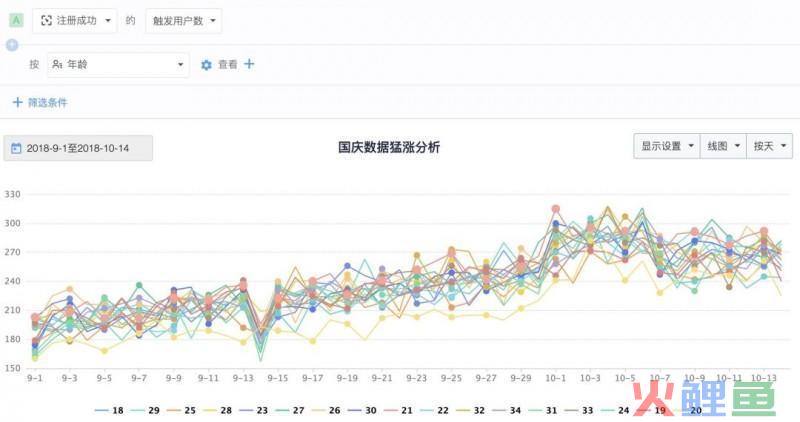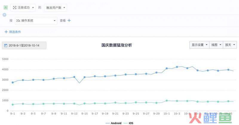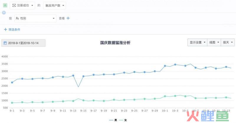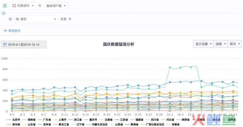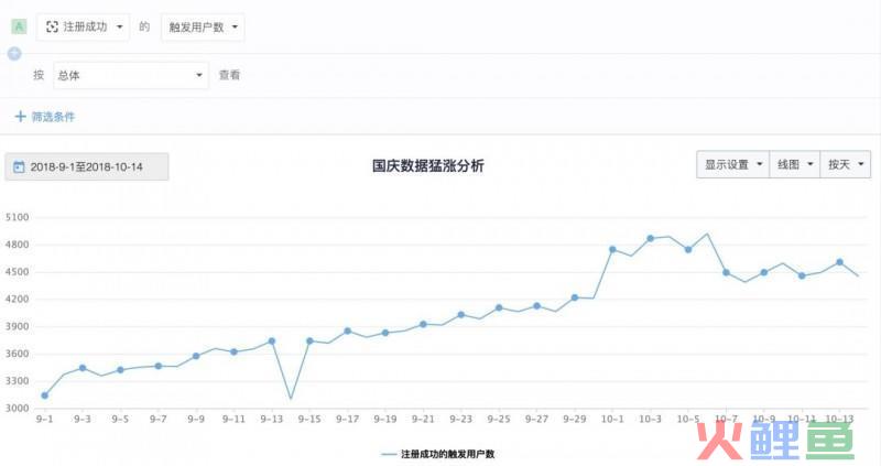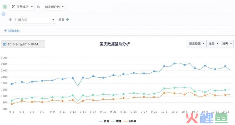 从上面这张注册成功的触发用户数折线图可以看出,国庆期间的注册用户日环比存在较高的数据增长差,就是折线右侧出现的一段高峰。