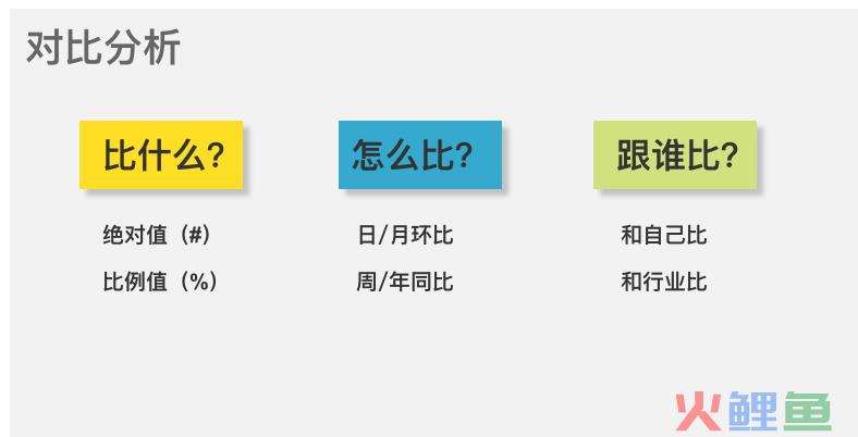 对比分析是最基础最常见的数据分析方法,能直观的看出事物某阶段的变化,并且可以准确、量化地表达出这种变化/差距是多少,重点从「比什么」「怎么比」「跟谁比」三个维度进行分析。