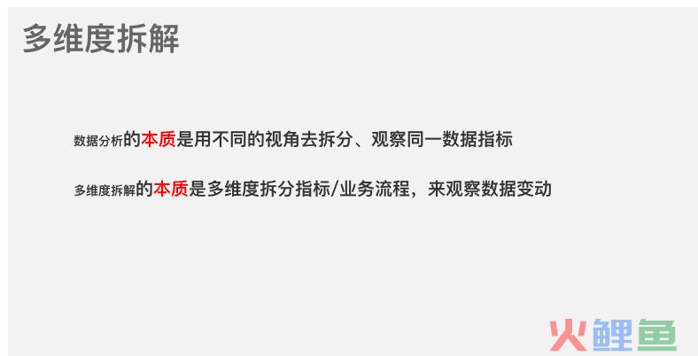 数据分析的本质是用不同的视角去拆分,观察同一数据指标。多维度拆解的本质多维度拆分指标/业务流程,来观察数据变动。