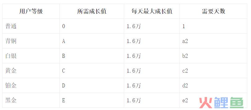 Step8:平台任一用户达到最高等级需要多久? 最后一步就是:“数据预测”了,step7在反推权重与分值制定的合理性,step8则在反推分层之间的合理性,也就是不同层级之间的跨越难度的合理性。 这里仅以用户从“普通-钻石”实现层级跨度所需的时间,当然,为了保障会员体系的合理性,如果运营精力和时间充足,可不同层级之间的跨度时间都充分计算。 仍以平台A为例,用户从普通到钻石需要多久? 假设A:用户A,参加平台上所有的项目。