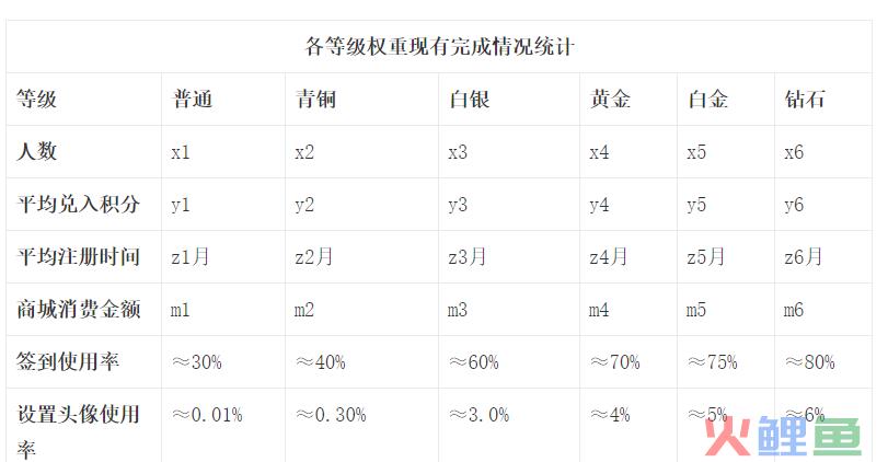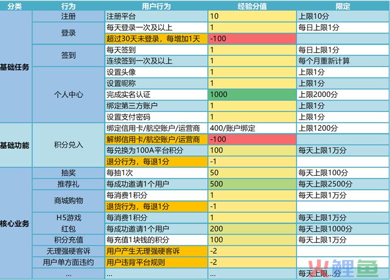 如果平台综合实际业务开展情况,且除了消费之外,也希望用户可以通过一系列任务达到活跃以及传播平台的目的,可罗列多个权重作为用户分层依据,并将权重按照重要性赋予不同的加分标准,如有必要,也可设置减分动作以及减分标准,最后进行累加,测算出用户最终的得分。 举例:以某通兑积分平台A为例,平台处于创建初期,用户在该平台上可按照一定的兑换比列将电信运营商、银行、航空类积分兑入并兑换成A积分。用户可使用A积分在平台进行消费,也可消耗A积分参与平台活动,如:抽奖类小游戏。平台为扩大日活月活等规模,鼓励用户兑入积分并进行签到、打卡、分享等操作。 我们现在要给平台A搭建会员体系: Step1:用户分几层? 考虑到平台出于创立初期,会员等级不需要细分地过于复杂;且当时正出于手游风靡时期,积分用户也多为年轻群体,所以将用户分为以下层级:普通、青铜、白银、黄金、白金、钻石。 Step2:用户分层的权重是哪些? 平台当时对用户的核心诉求为:消费+活跃,遂按照重要性罗列出如下权重:消费、兑入运营商&银行&航空积分、签到、登陆、参与平台活动。 Step3:每个权重的加分值如何设置? 按照权重重要性设置不同得分值,后期可视平台实际运营需求调整。 Step4:是否需要设置减分值? 平台设置了减分项,如:退货、无理强硬客诉、用户当方面违规操作等,并设置对应减分值。 Step5:如何最终计算单个用户的综合得分值? 按照不同权重的加分/减分值进行累加,计算出平台现有单个用户的得分值。