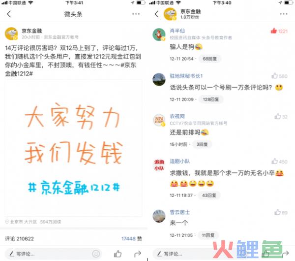 12月11日晚,京东金融在微头条上发布一条动态“14万评论很厉害吗?”并配上一张“大家努力,我们发钱”图片,经过粉丝接力、系统推荐之后,点燃头条用户参与热情。