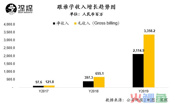 跟谁学2019年全年取得净收入21.15亿元人民币,相比较2018年全年增长432.3%;公司毛收入在2019年也达到33.58亿元。
