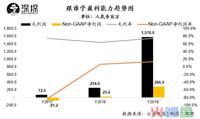 在经历了2017年资本密集入场、2018年团队规模扩张,2019年重金推广营销后,在线教育似乎正一步一步走上快车道。跟谁学业绩在2019年的爆发,一方面体现的是公司自身在市场中认可度的提高,同时也是在线教育行业整体的一个缩影。