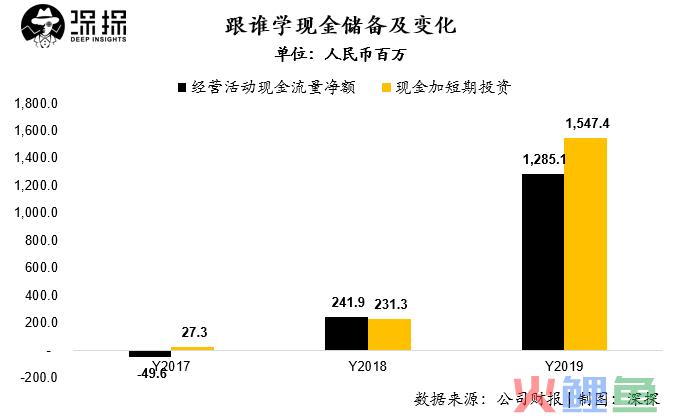 跟谁学2019年经营活动现金流量净额为12.85亿元人民币,远高于2018年的2.42亿元人民币,体现了极强的自身造血能力。公司账面现金及短期理财余额也达到历史最高的15.5亿元人民币。