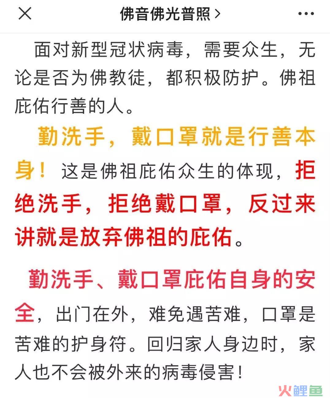 就像上个月,一个名为“佛音佛光普照”的公号出了一篇爆款,将戴口罩形容为积德积善,网传作者创建这个公号并发文,只是为了“骗”家人乖乖戴口罩,结果误打误撞双10w+。虽然消息不知真假,不过时至今日,该公号确也再没发过其他推文。