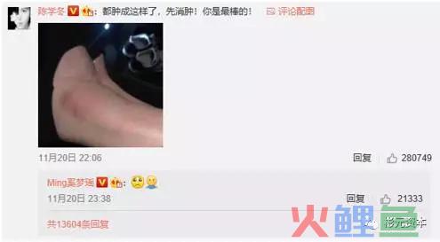 11月20日陈学冬在奚梦瑶摔倒之后的微博Po图留言,随即大批围观群众赶到现场,奚梦瑶陈学冬成为热搜,事件开始发酵,成为了一个娱乐事件现场,最终该条评论收获了28万次点赞。