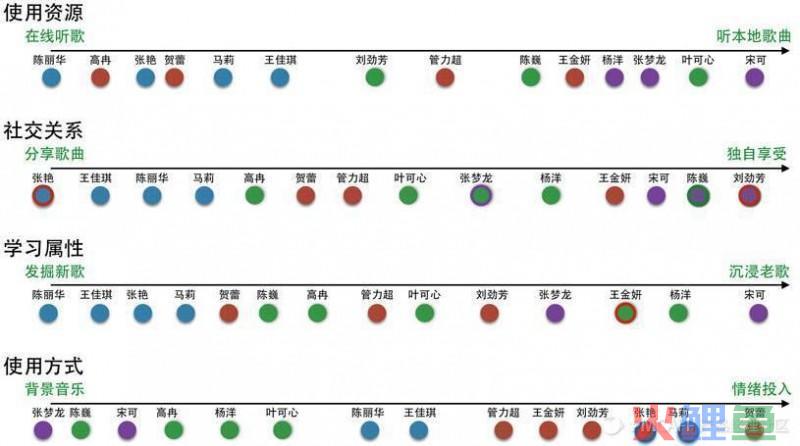 我们对关键行为分别做出行为轴,根据访谈收集的信息把用户放到行为轴上。每个受访者在轴上的位置是否精确并不重要,他们之间的相对位置关系更为重要,不同轴上的受访主题集群之间具有明显不同的行为模式。