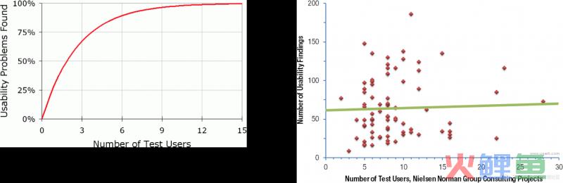 此外,Nielsen还给出了以下的一份数据:根据83例NNgroup最近进行过的可用性咨询的案例分析可以得出下右图的可用性问题数量——招募用户数量的关系。我们可以看到,在招募5-8名用户的时候,就足以暴露出系统中的大部分可用性问题了。而此时再测试更多的用户,并不会为我们的洞察带来明显的提升。因此在我们的可用性测试中,我通常会遵循以下的原则——这也是其他定性用户研究用户招募的一个通用原则——至少对5名用户进行测试,当测试完第五名用户的时候,如果我们发现问题的分布足够集中,或者是不再出现新的问题,那么针对这个目标的可用性测试就可以结束了。如果此时还在暴露出新的问题,那么我们就还需要继续进行测试,直到不再暴露明显的新问题为止。