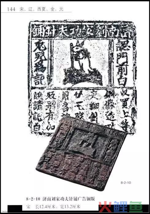 同为北宋时期的“济南刘家功夫针铺”是中国乃至世界最早的商标广告,铜版正中偏上刻着一只拿着铁杵捣药的白兔,四周刻着小字:上方为“济南刘家功夫针铺”;左右为“认门前白兔儿为记”;下方为“收买上等钢条,造功夫细针。不误宅院使用,转卖兴贩,别有加饶,谓记白”。