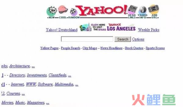 1996年10月的雅虎页面,可以看到搜索框上方出现了小块的广告区域。