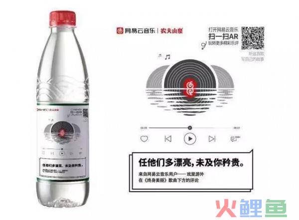 2017年8月,网易云音乐再次跨界搞事情,携农夫山泉推出30款乐瓶,不仅有音乐、有故事,还有AR黑科技。