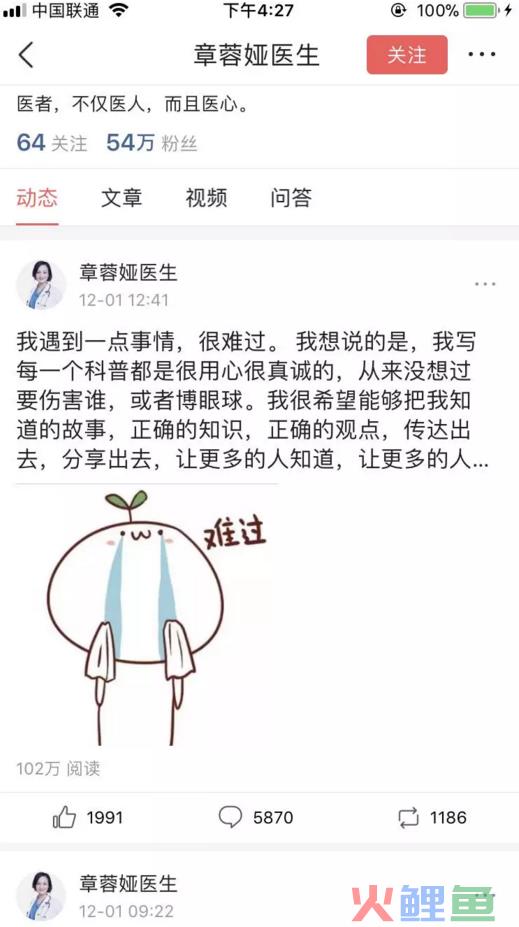 除在评论区刷存在感外,也要多发一些有趣味,强调个人态度、观点的微头条内容,涨粉非常快。比如被官方推荐的,1个月涨粉50万的章蓉娅医生,主业是卖萌逗网友,副业是健康科普,每条微头条都能过100万阅读。