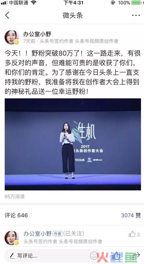 11月22日,在一年一度的今日头条创作者大会上,张一鸣宣布推出“千人百万粉”计划,表示未来一年今日头条要扶持出1000个100万粉丝大号!