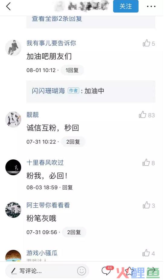 微博、微信兴起早期,都曾流行过互相关注。在没有任何基础的情况下,这不失为早期积累粉丝的一个选择。现在,在头条号上,也活跃着一批留言互粉的用户,架势不输于当年的微博。