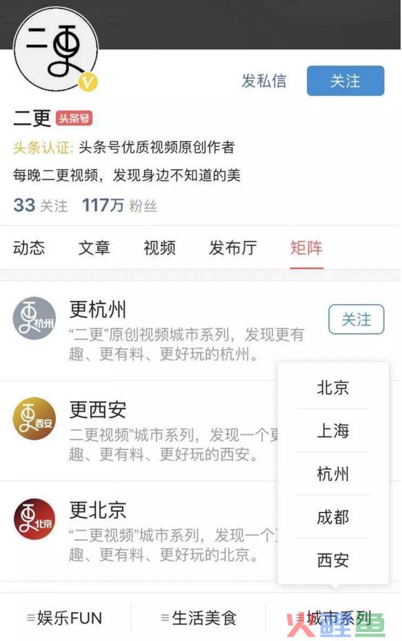 (3)大号带小号,办公室小野就常给旗下的「办公室小作」「爷爷等一下」等新号导流,二更大号也会经常转发「更财经」「更北京」的矩阵号。