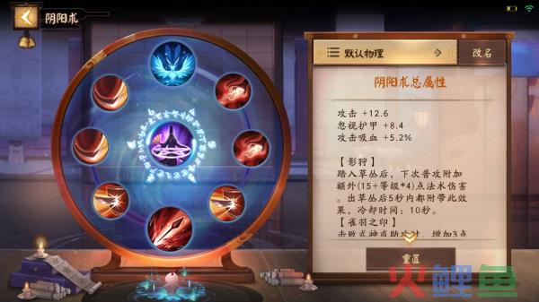 为了保障游戏公平竞技的原则,《决战!平安京》取消了“铭文系统”,取而代之的是让所有玩家处于同一起跑线的“阴阳术”。“阴阳术”其实类似于《英雄联盟》中的符文系统,只是《决战!平安京》的“阴阳术”不需要购买。“阴阳术”一共有九个位置可供选择,位于中间位置的是玩家选择的主属性,主要为式神英雄提供被动效果;正上方的是副属性,主要提升玩家的成长上线;其余围绕在周围的6个位置分别可以为玩家提供攻击力、法强、吸血、暴击、生命恢复等属性加成。玩家可以根据自身对于式神英雄的理解,搭配独特的“阴阳术”进行战斗。