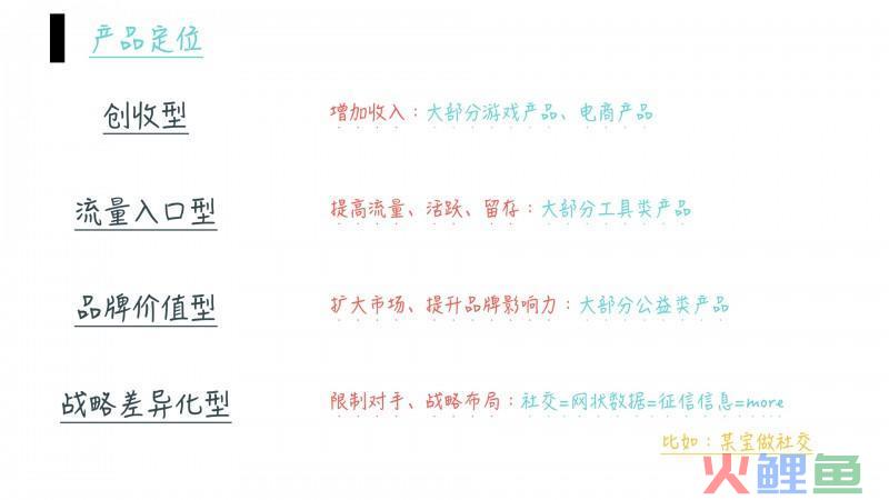 产品定位的划分众说纷纭,笔者认为以上四种是比较中肯清晰的。分析产品定位可以避免我们做无谓的比较,比如不能讲一个公益类产品的营收跟游戏产品相比,这是没有意义的。透过产品定位我们可以看到目前市场内各个公司的战略布局和份额情况,这样对我们选择定位也提供了支点。