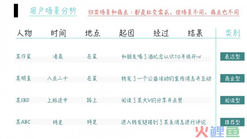 比如一个表达型用户,在表达的场景下,他的痛点就是编辑、分享功能的完善。而到了白天的商业场景下,转发功能反而成为了重点。通勤场景的阅读需求,可能会对收藏功能有需求。但是对于社交场景,只要能满足私信和群组就可以了。