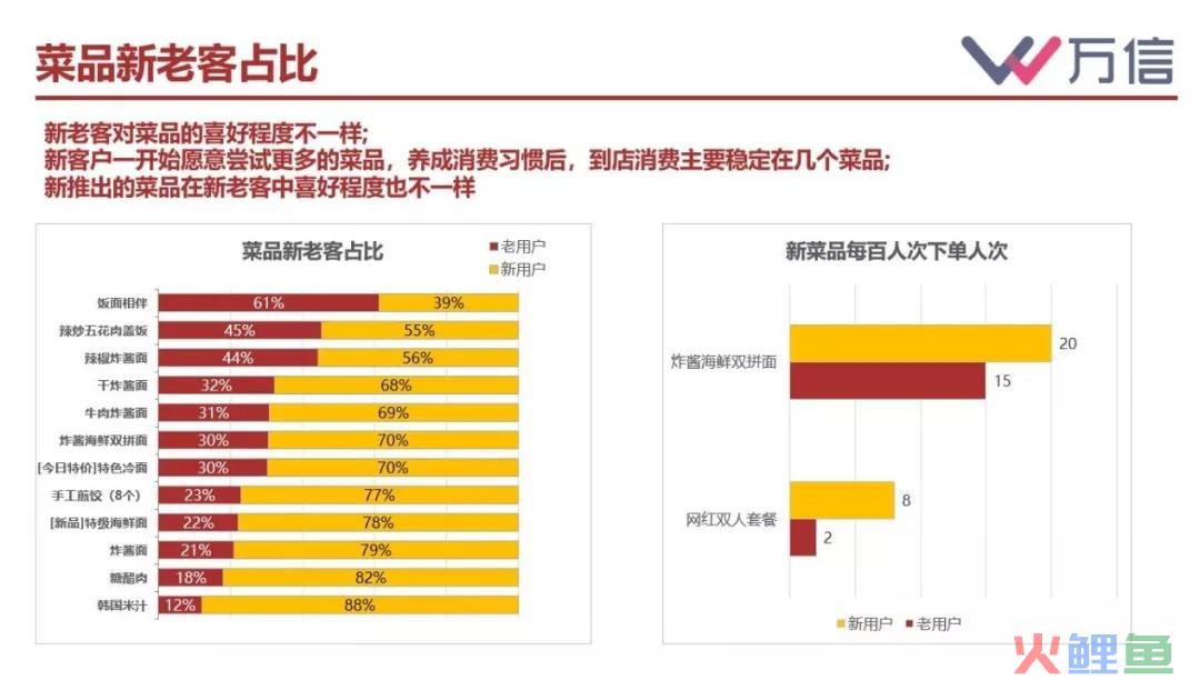 该店推出了两款新品,通过万信餐饮新零售业务全场景SaaS数据统计分析显示,“炸酱面海鲜双拼面”,新客户每百人有20人下单,老客户每百人有15人下单,差别不是很大,说明此款新菜对新老客都有吸引力,是一款广泛受欢迎的菜品;而“网红套餐”这款菜品新老客占比差异就非常大,新客户每百人有8人下单,而老客户每百人仅有2人下单,说明这个套餐更吸引新客户