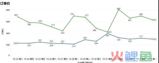 图中显示为某使用万信餐饮SaaS商家会员和非会员订单金额的对比,最高的时候两者之间的差别甚至高达3倍以上。