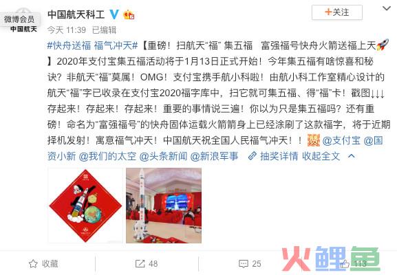 支付宝和中国航天科工宣布,即将发射“富强福号”快舟火箭。并且,设计了专属福字,随火箭升空。