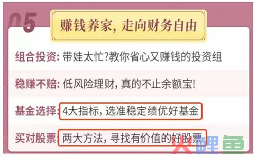 上面的详情页中,用到的基本属于”给予新知”的方法。比如“4大指标,选准稳定绩优好基金”、“两大方法,寻找有价值的好股票”就是依靠的“数字辅助+展现结果”。一方面让用户觉得这是他不知道的知识,另一方面显得容易这个技巧可量化容易掌握。