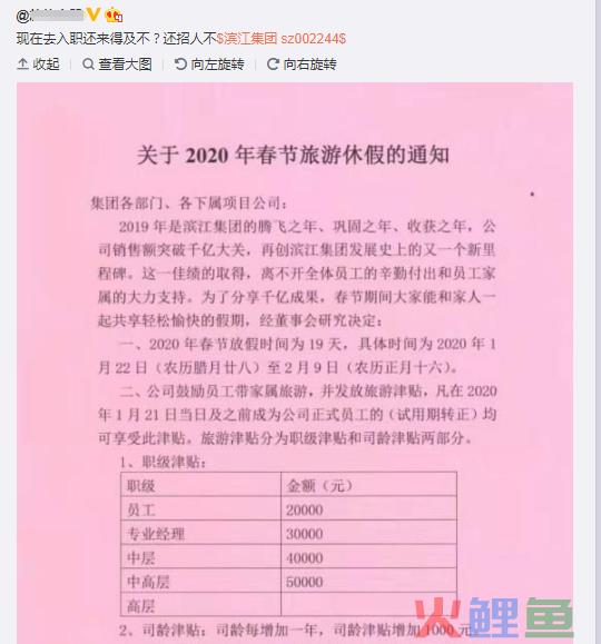 近日一份杭州上市公司滨江集团(002244,SZ)的春节员工福利曝光,趁着公司销售额达千亿的时节,滨江集团公布明年春节放假19天,同时,向全员发放2万——5万元不等的旅游津贴。