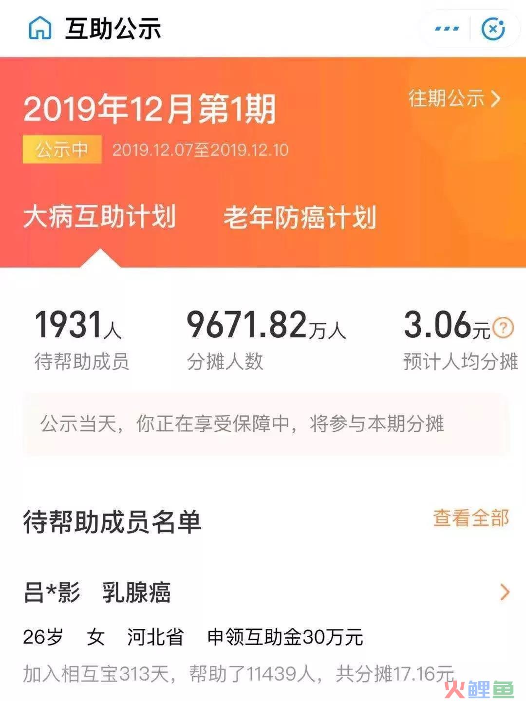 尹铭知道,相互宝还有很多问题要解决,比如突破圈层壁垒做用户教育。 相互宝面对的不仅仅是一二线城市的用户,还有更广泛的下沉市场的农村用户,不同用户的文化背景不同、认知程度不同,如何在这样的背景下打造一套普世的规则,从而避免不必要的麻烦,将是相互宝很长一段时间都将面临的问题。 比如,相互宝规定用户发生意外96小时后才可以赔付。原因在于96小时以内尚处于意外事故范畴,而超过96小时之后发生的案件,则属于因为意外事故造成了重大疾病。前者属于保险领域,而相互宝则属于大病互助,是后者涉及的范畴。 怎样确保初中甚至小学文化程度的用户都能理解复杂的保障规则,考验着运营能力。相互宝的做法是先进行大规模的用户教育。尹铭给不到十人的内容团队的考核标准,便是每天生产“10万+”的内容,他希望通过社区中沉淀的有用的内容,提高用户的使用频率和使用时长,从而进一步提高用户对保障的认知水平。 “我相信未来的保险教育就是通过内容,但保险的内容很容易走到销售的极端,我希望相互宝互助社区的内容本质上是健康教育”,尹铭表示。同时,用户对互助分摊金的心理预期和付费意愿之间有一定差距,也是相互宝需要解决的问题。传统保险的分摊金是年费制,一次性扣完,但相互宝模式则是免费加入,有赔付案例发生时再扣款,半个月一扣,每次会公示。用户担心的是,随着加入人数的增多,相互宝的分摊金额会持续上涨。相对于早期一次几分钱,2019年12月第一期的分摊金为3.02元。