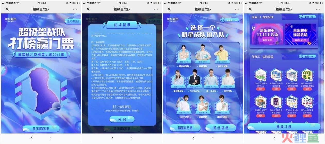 京东的明星打榜活动,粉丝可以选择自己的爱豆,完成指定的任务就可以获得给自己爱豆打榜的能量值,能量值排名第1-3名的明星可以得到京东赞助的线下媒体曝光。