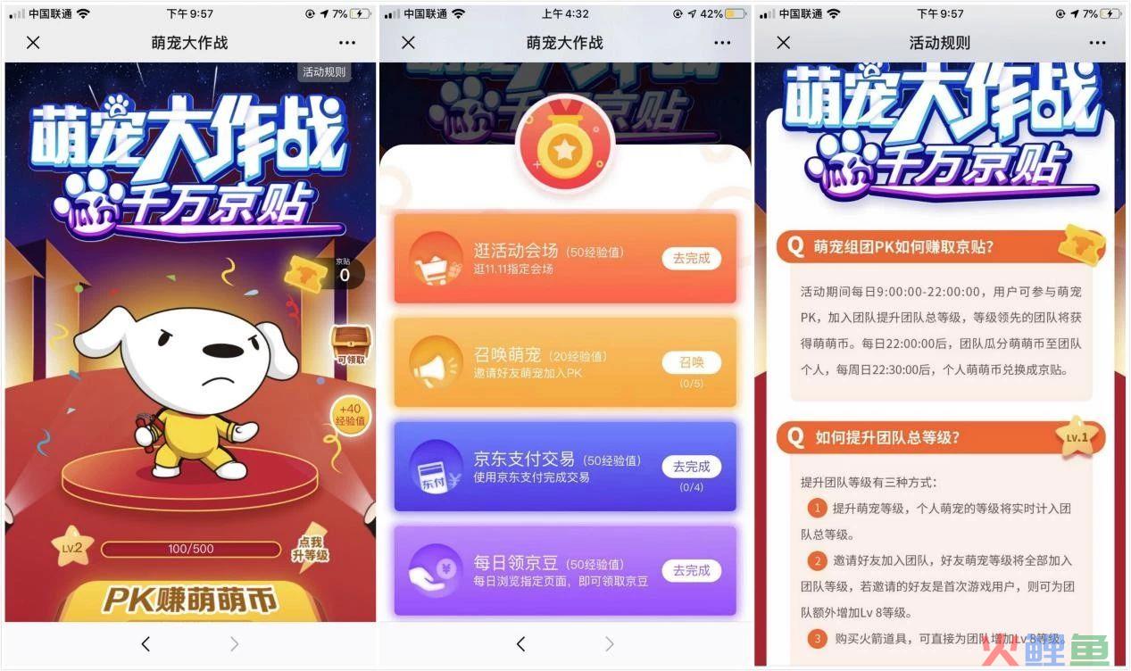 京东的一个“萌宠大作战”——养京东狗赚京贴(在京东商城可以当现金用)的活动,活动玩法就是用户做指定的任务赚取经验值,狗狗就会升级。这里就有2个任务属于违规:去逛双11活动会场和指定页面即可获得经验值。