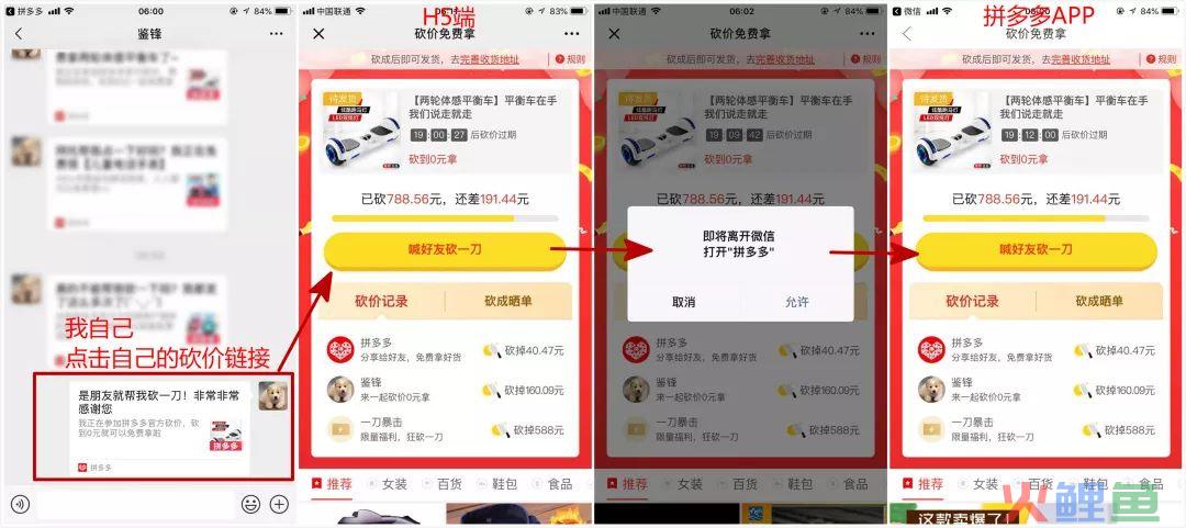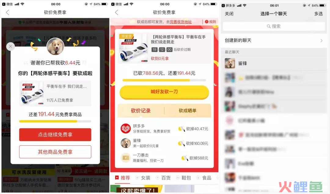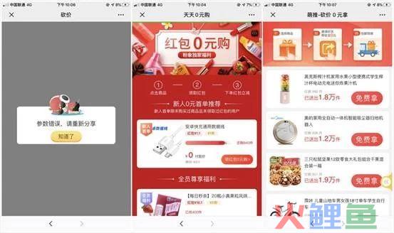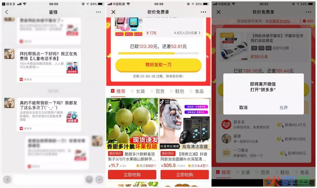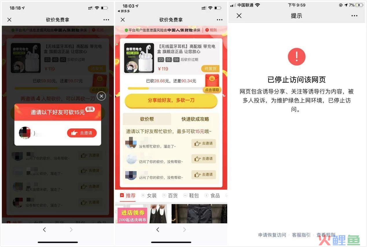用来举例砍价诱导分享的封禁案例就是拼多多,体验过拼多多砍价的小伙伴可能都清楚:前面的砍价金额会更高,刺激你更强的分享动力,后面金额会慢慢低至1分钱/人砍价,甚至有时候还会出现砍的钱会上升,让助力用户产生愧疚感,协助转发。