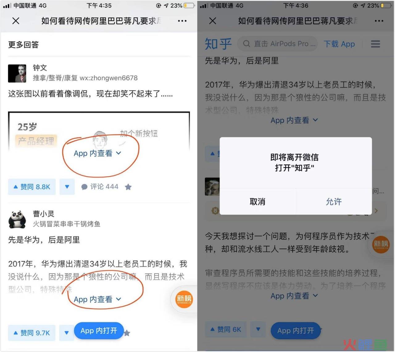 总得来说,微信要求如果一条外链告诉用户可以得到什么,就必须在当前页就完成,凡是告诉用户可以怎样,但又需要去App实行的,均会被视为违规。